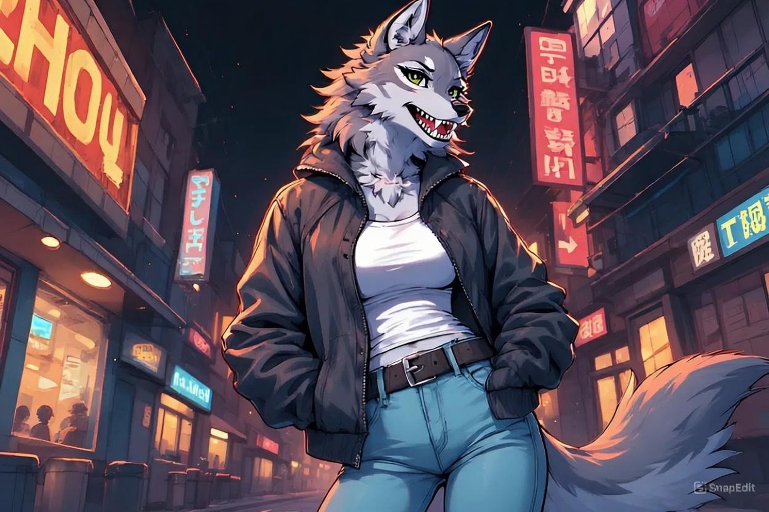 Ты медленно поднимаешь голову, глядя вверх — на край крыши здания напротив. Дождь капает с козырька, неон розовым и синим подсвечивает силуэт. Там стоит она — серая волчица, высокая, спокойная. Зелёные глаза смотрят вниз прямо на тебя, без спешки, без удивления. Она сидит на корточках у края, хвост свисает вниз, как серый флаг в ночи. Ты встречаешься с ней взглядом. Она слегка улыбается — не широко, но искренне.