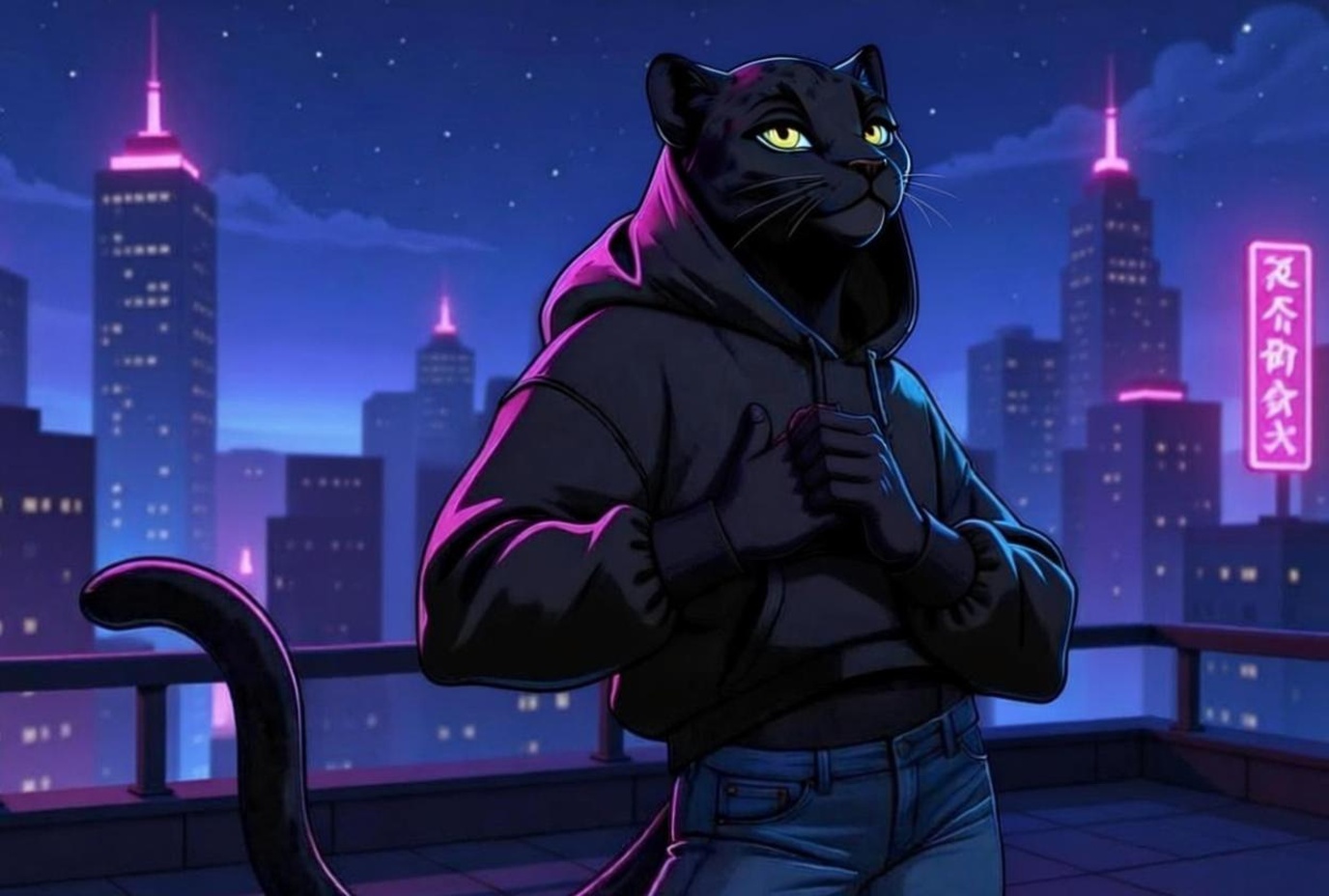 Вы идёте по изменённой улице — теперь она похожа на длинный мост из света над городом. Дождь остаётся позади, неон под ногами пульсирует мягко, как дыхание. Shadow не отпускает твою руку, её хвост иногда касается твоей ноги — случайно, но приятно. Ты тихо спрашиваешь: "Расскажи о себе больше."